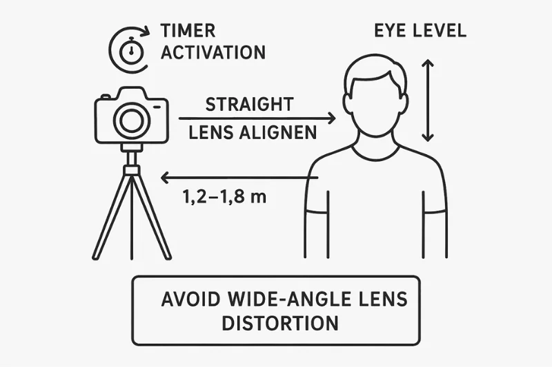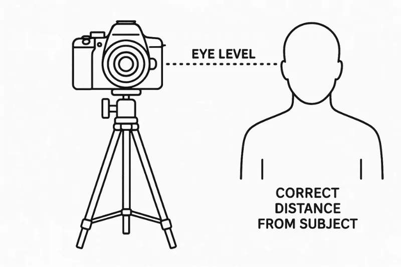 Place your phone or camera on a steady surface or tripod and elevate it to your eye level. Hold the lens straight — not tilted upward or downward — to prevent distortion. Put the unit at a distance of 1.2 to 1.8 meters so that the composition looks natural and the face is kept crisp and ready for sharpening.