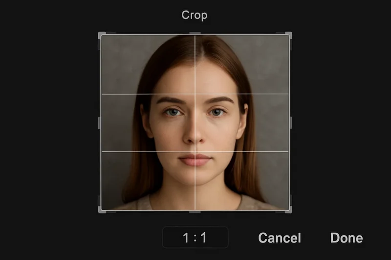 Make a crop to 1:1 to turn your photo into a square. Keep your head centered with a little space over the hairline. This step formats your image for the square crop required for U.S. sale.