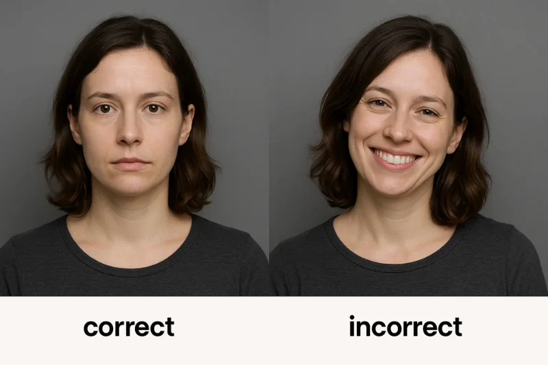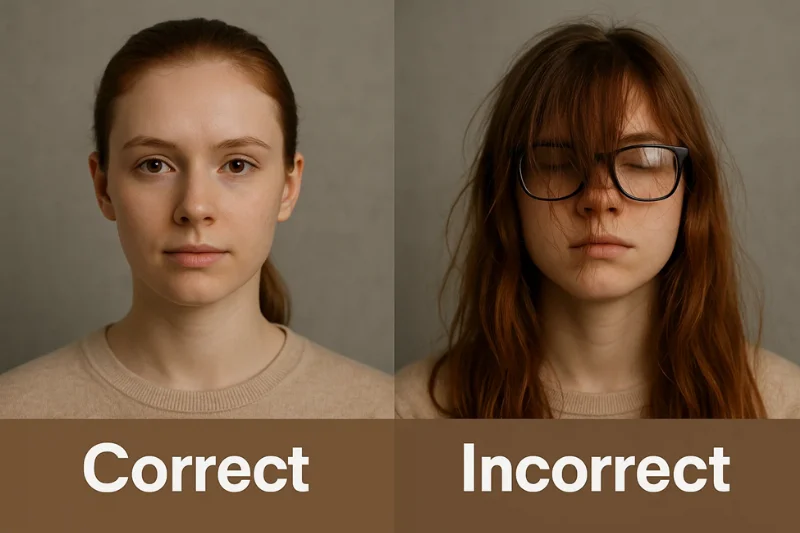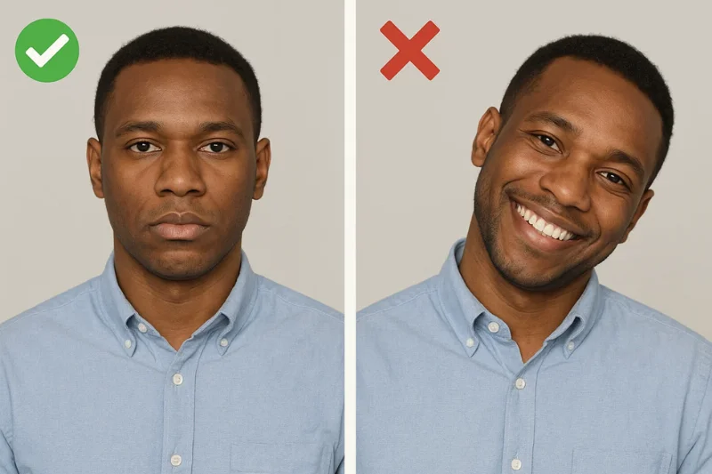 Your head should be centered in the frame, with your shoulders showing and your face pointing completely toward the camera. It understands it like you are taking a portrait where the only thing on its mind is balance: equal visual space on both sides, equal amounts of light across your face, and the chin and top of the head naturally fitting in the frame. Maintain your level portrait so that the government gets the proportions they want.