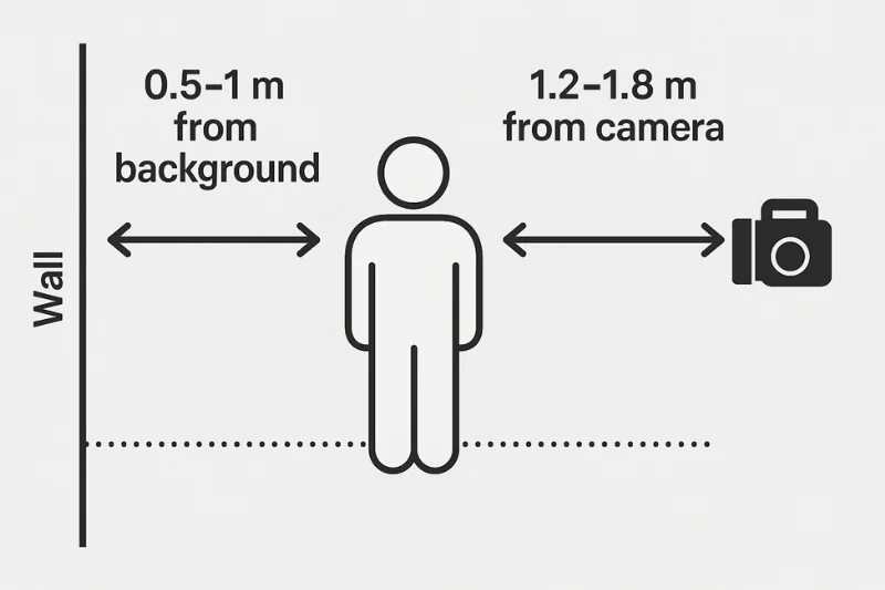 Distance also plays a big role in shadow elimination. Standing too close to the wall produces a dark halo around your head. The sweet spot is a background distance of 0.5-1 meter, which softens the shadows and ensures that the background is fully visible in the image.