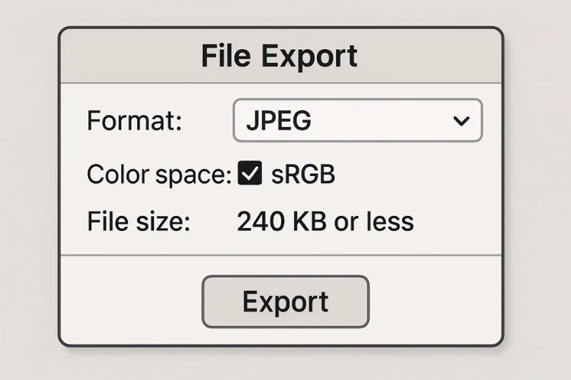 Save the final image as a JPEG with the sRGB color profile. Ensure that the file size stays below the size limit of 240 KB to pass the automated check. Keeping the file size small then helps prevent loss of detail or pixelation in the image while the image is compressed.