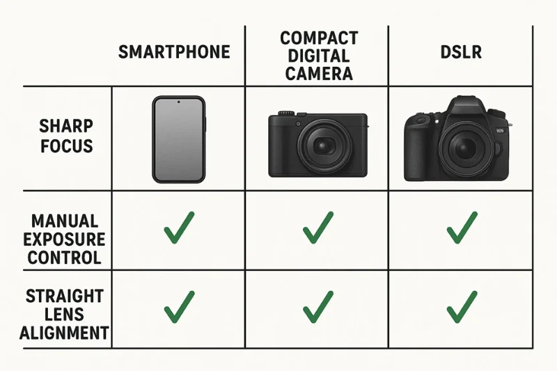 You may use a smartphone or a simple digital camera — both will be sufficient as long as the photo is crisp and has good exposure. With today’s phones it’s easy to take good quality photos, and built-in stabilization helps reduce blur. The important thing is to have the lens at eye-level and to keep the frame straight.If your device supports manual modes, maintaining the exposure stable and the white balance neutral will result in the clean look which the government requires for passport photos.