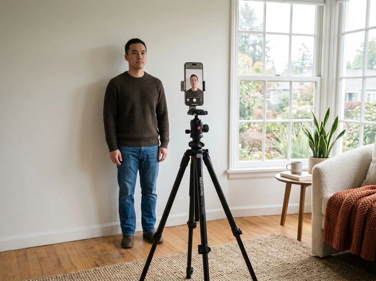 Managing the lighting. Preferably, stay by the window in daylight. If using artificial light sources, position your primary light source (window or lamp) at a 45° horizontal angle to your face, slightly above eye level. If using two sources, place the secondary light on the opposite side at equal or slightly lower intensity to fill shadows. Diffuse harsh sources with a white curtain, frosted glass, or a white sheet. Avoid overhead ceiling lights entirely — they flatten and shadow simultaneously. The goal is even, shadow-free illumination across the entire face, including under the chin.