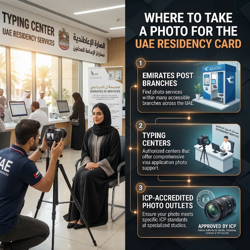 Residency card photos can be taken at most photo studios, post offices, and authorized service centers across the UAE. Many Emirates Post branches, typing centers, and ICP-accredited photo outlets offer instant photo services that meet official specifications.