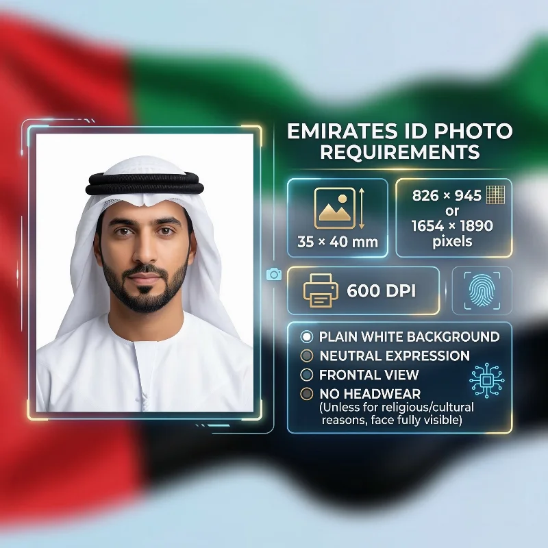Following the official Emirates ID photo requirements — 35 × 40 mm size or 826 x 945 / 1654 × 1890 pixels at a minimum of 600 DPI, plain white background, neutral facial expression, and other essential parameters — is key to a successful application. This 2026 UAE Identity Card Photo Guide covers all ICP government specifications for the photo you must submit.