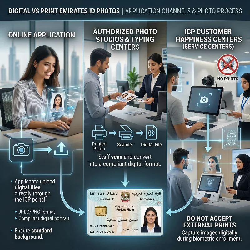 Emirates ID mandates digital biometric photos for all applications, but submission channels differ: