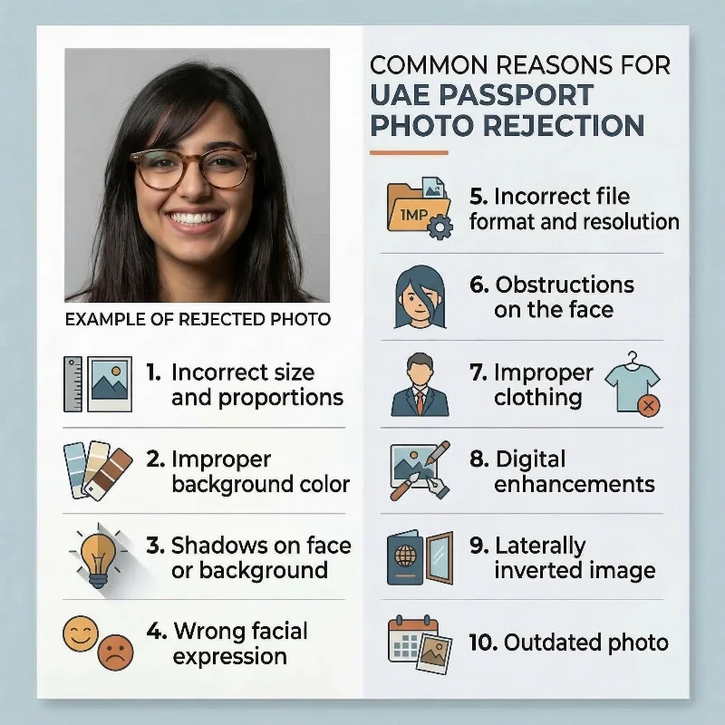 10. Glasses | Glasses should be removed in the UAE passport photo. Tinted glasses — including prescription ones — and sunglasses are prohibited. Applicants who wear glasses or eye patches for medical reasons, such as following eye surgery, must include a signed statement from their treating hospital or medical provider. |
